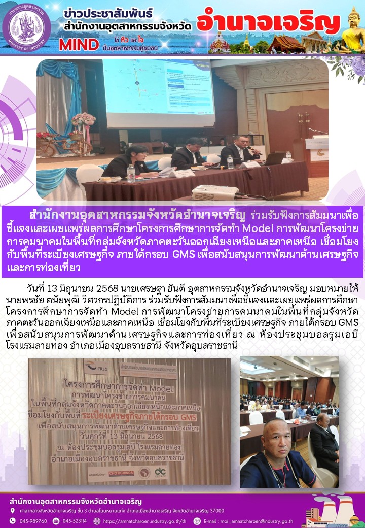 สำนักงานอุดสาหกรรมจังหวัดอำนาจเจริญ ร่วมรับฟังการสัมมนาเพื่อ ชี้แจงและเผยแพร่ผลการศึกษาโครงการศึกษาการจัดทำ Model การพัฒนาโครงข่ายการคมนาคมในพื้นที่กลุ่มจังหวัดภาคตะวันออกเฉียงเหนือและภาคเหนือ เชื่อมโยงกับพื้นที่ระเบียงเศรษฐกิจ ภายใต้กรอบ GMS เพื่อสนับสนุนการพัฒนาด้านเศรษฐกิจและการท่องเที่ยว