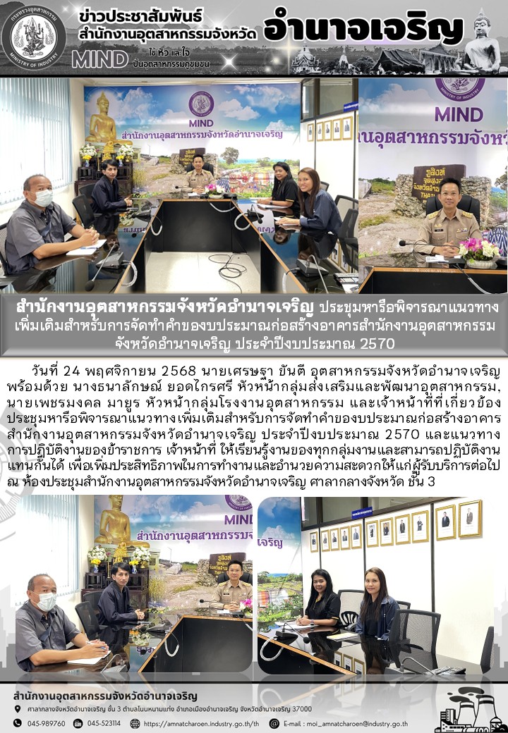 สำนักงานอุตสาหกรรมจังหวัดอำนาจเจริญ ประชุมหารือพิจารณาแนวทาง เพิ่มเติมสำหรับการจัดทำคำของบประมาณก่อสร้างอาคารสำนักงานอุตสาหกรรม จังหวัดอำนาจเจริญ ประจำปีงบประมาณ 2570