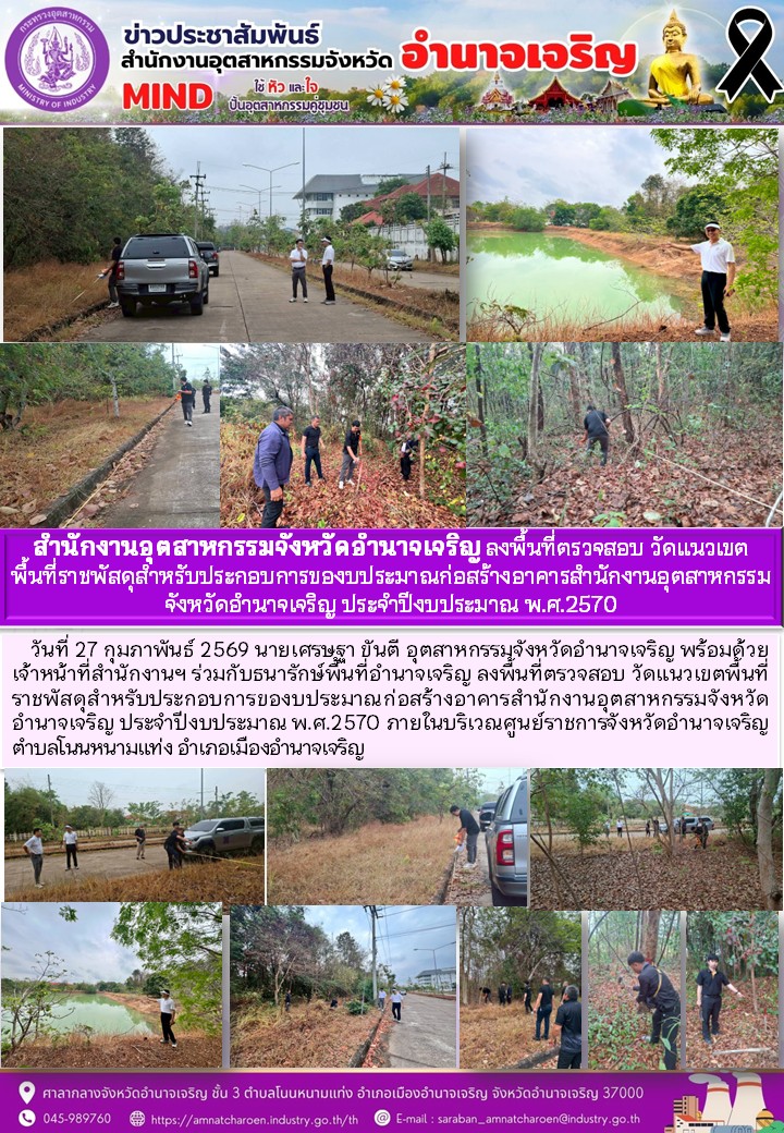 สำนักงานอุตสาหกรรมจังหวัดอำนาจเจริญ ลงพื้นที่ตรวจสอบ วัดแนวเขต พื้นที่ราชพัสดุสำหรับประกอบการของบประมาณก่อสร้างอาคารสำนักงานอุตสาหกรรม จังหวัดอำนาจเจริญ ประจำปีงบประมาณ พ.ศ.2570