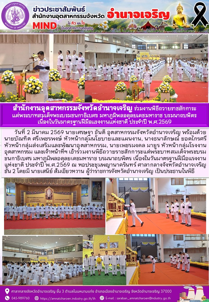สำนักงานอุตสาหกรรมจังหวัดอำนาจเจริญ ร่วมงานพิธีถวายราชสักการะ แ่พระบาทสมเด็จพระบรมชนกาธิเบศร มหาภูมิพลอดุลยเดชมหาราช บรมนาถบพิตร เนื่องในวันมาตรฐานฝีมือแรงงานแห่งชาติ ประจำปี พ.ศ.2569