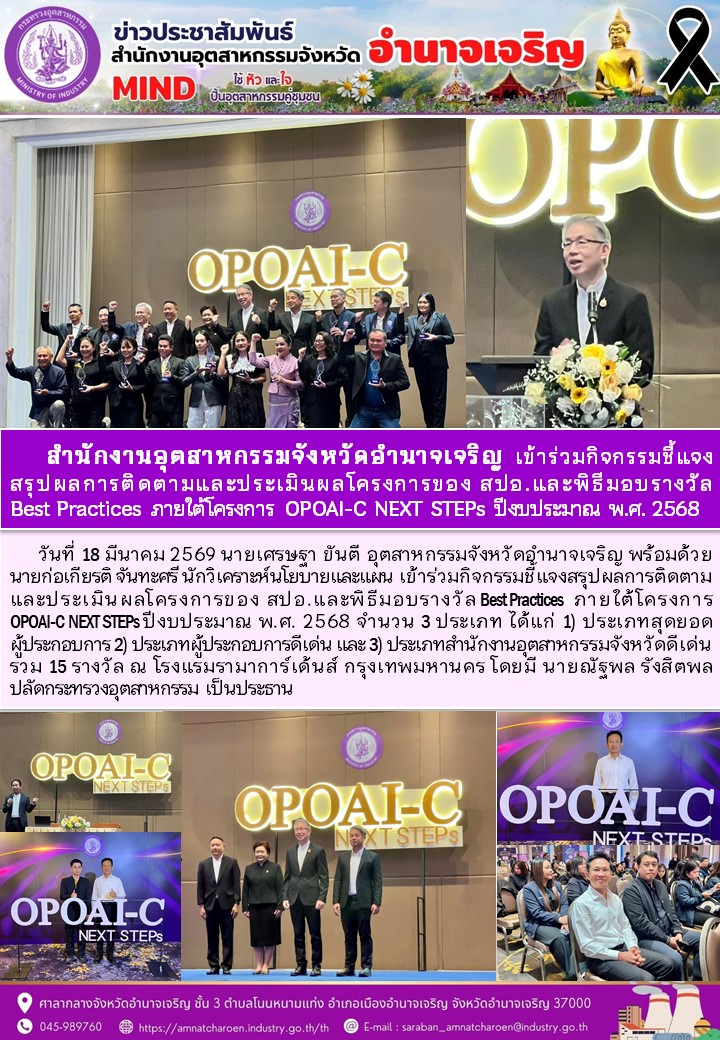 สำนักงานอุตสาหกรรมจังหวัดอำนาจเจริญ เข้าร่วมกิจกรรมชี้แจง สรุปผลการติดตามและประเมินผลโครงการของ สปอ.และพิธีมอบรางวัล Best Practices ภายใต้โครงการ OPOAI-C NEXT STEPs ปีงบประมาณ พ.ศ. 2568