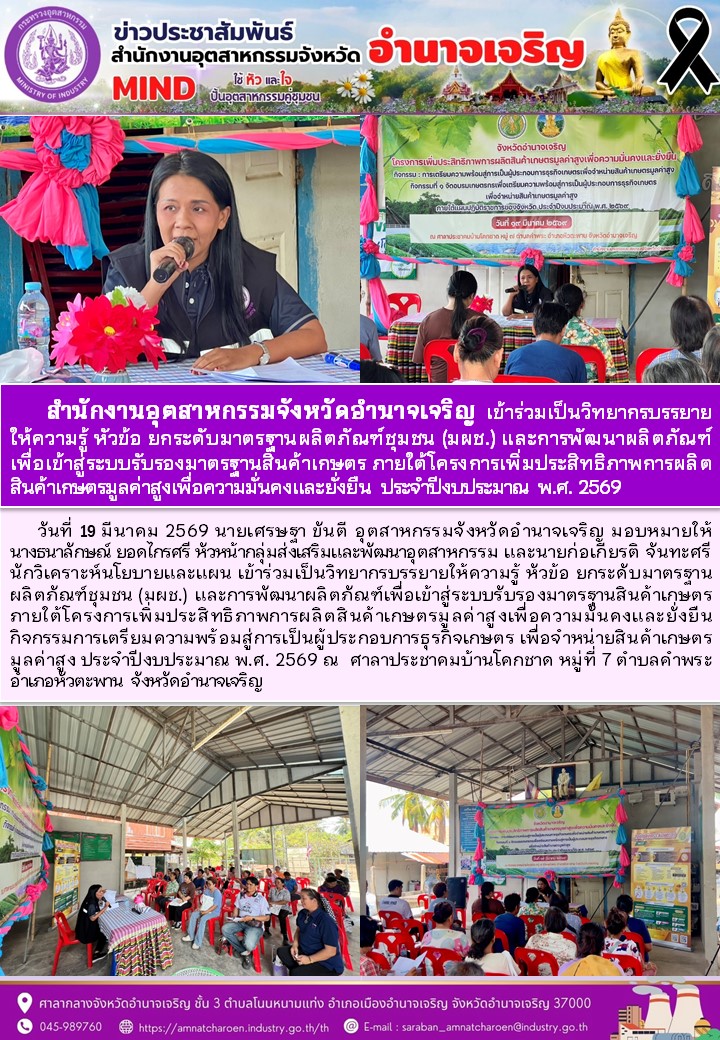 สำนักงานอุตสาหกรรมจังหวัดอำนาจเจริญ เข้าร่วมเป็นวิทยากรบรรยาย ให้ความรู้ หัวข้อ ยกระดับมาตรฐานผลิตภัณฑ์ชุมชน (มผช.) และการพัฒนาผลิตภัณฑ์ เพื่อ เข้า สู่ ระบบ รับรอง มาตรฐาน สินค้า เกษตร ภาย ใต้ โครงการ เพิ่ม ประสิทธิภาพ สินค้าเกษตรมูลค่าสูงเพื่อความมั่นคงและยั่งยืน ประจำปีงบประมาณ พ.ศ. 2569