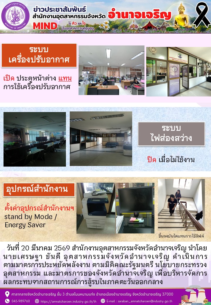 สำนักงานอุตสาหกรรมจังหวัดอำนาจเจริญ ดำเนิน การตามมาตรการประหยัดพลังงาน ตามมิติคณะรัฐมนตรี นโยบายกระทรวงอุตสาหกรรม และ มาตรการ ของ จังหวัด อำนาจเจริญ