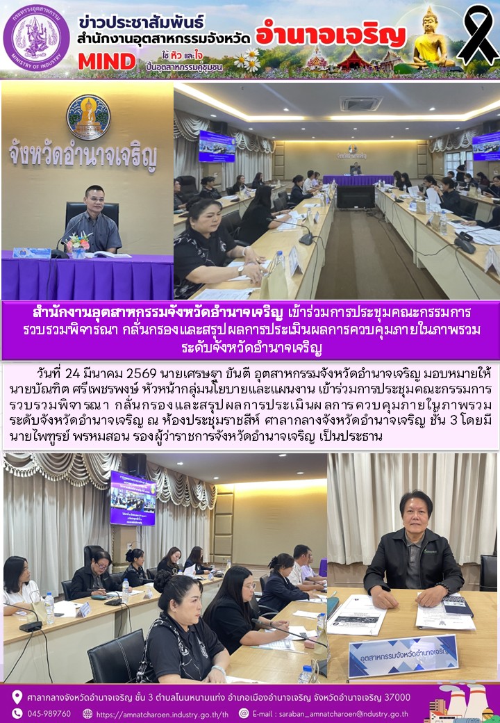 สำนักงานอุตสาหกรรมจังหวัดอำนาจเจริญ เข้าร่วมการประชุมคณะกรรมการ รวบรวมพิจารณา กลั่นกรองและสรุปผลการประเมินผลการควบคุมภายในภาพรวม ระดับจังหวัดอำนาจเจริญ