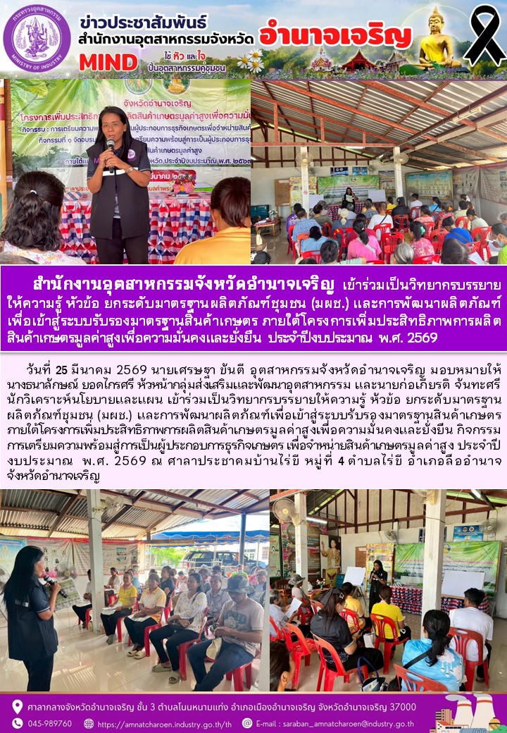 สำนักงานอุตสาหกรรมจังหวัดอำนาจเจริญ เข้าร่วมเป็นวิทยากรบรรยาย ให้ความรู้ หัวข้อ ยกระดับมาตรฐานผลิตภัณฑ์ชุมชน (มผช.) และการพัฒนาผลิตภัณฑ์ เพื่อ เข้า สู่ ระบบ รับรอง มาตรฐาน สินค้า เกษตร ภาย ใต้ โครงการ เพิ่ม ประสิทธิภาพ การ สินค้าเกษตรมูลค่าสูงเพื่อความมั่นคงและยั่งยืน ประจำปีงบประมาณ พ.ศ. 2569