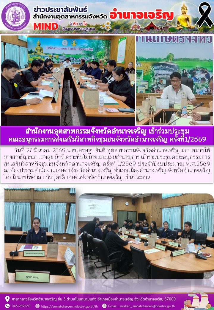 สำนักงานอุตสาหกรรมจังหวัดอำนาจเจริญ เข้าร่วมประชุม คณะอนุกรรมการส่งเสริมวิสาหกิจชุมชนจังหวัดอำนาจเจริญ ครั้งที่1/2569