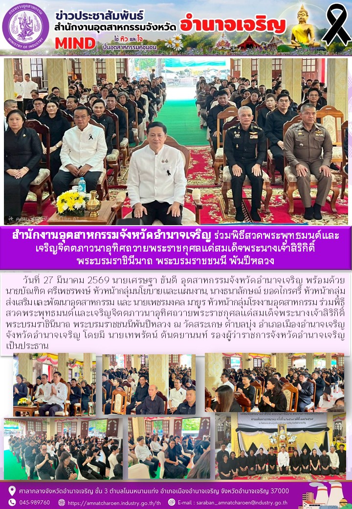 สำนักงานอุตสาหกรรมจังหวัดอำนาจเจริญ ร่วมพิธีสวดพระพุทธมนต์และ เจริญจิตตภาวนาอุทิศถวายพระราชกุศลแต่สมเด็จพระนางเจ้าสิริกิติ์ พระบรมราชินีนาถ พระบรมราชชนนี พันปีหลวง