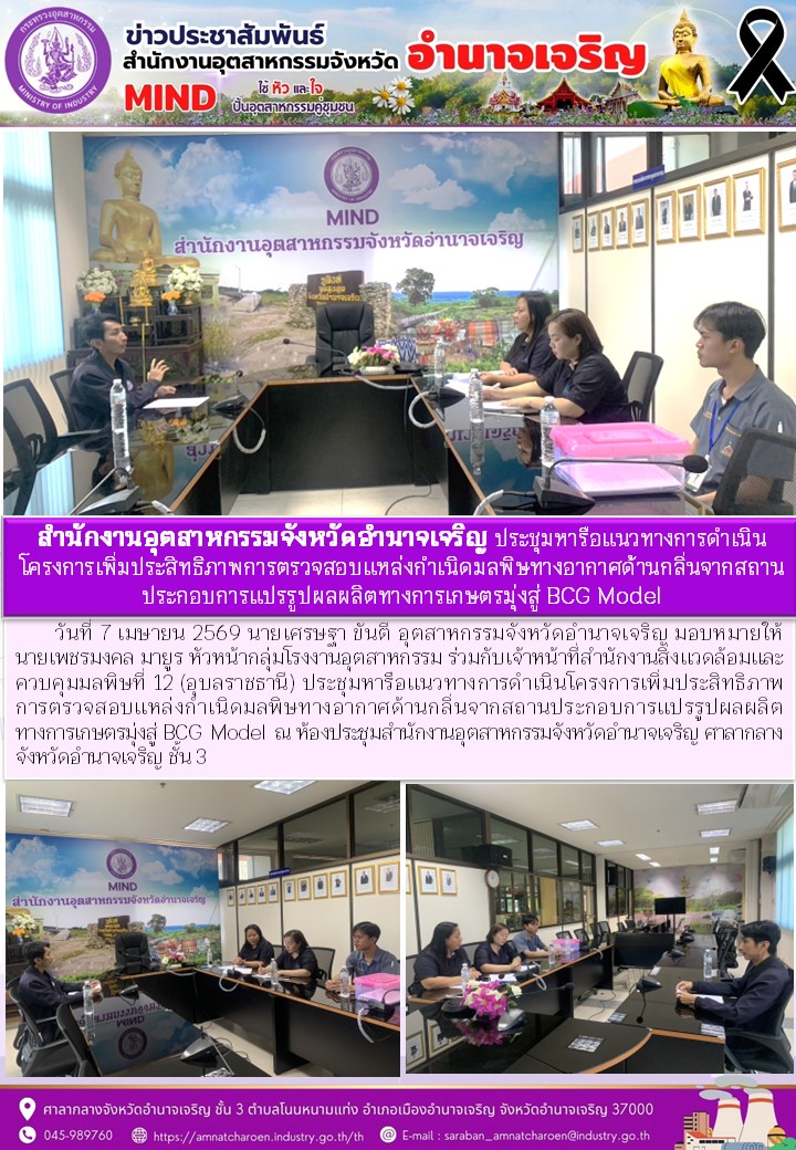 สำนักงานอุตสาหกรรมจังหวัดอำนาจเจริญ ประชุมหารือแนวทางการดำเนิน โครงการเพิ่มประสิทธิภาพการตรวจสอบแหล่งกำเนิดมลพิษทางอากาศด้านกลิ่นจากสถาน ประกอบการแปรรูปผลผลิตทางการเกษตรมุ่งสู่ BCG Model