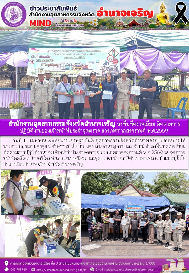 สำนักงานอุตสาหกรรมจังหวัดอำนาจเจริญ ลงพื้นที่ตรวจเยี่ยม ติดตามการ ปฏิบัติงานของเจ้าหน้าที่ประจำจุดตรวจ ช่วงเทศกาลสงกรานต์ พ.ศ.2569
