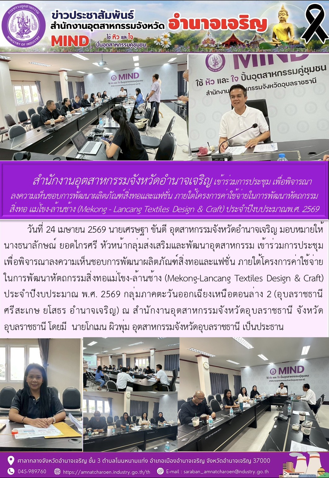 สำนักงานอุตสาหกรรมจังหวัดอำนาจเจริญ เข้าร่วมการประชุม เพื่อพิจารณาลงความเห็นชอบการพัฒนาผลิตภัณฑ์สิ่งทอและแฟชั่น ภายใต้โครงการค่าใช้จ่ายในการพัฒนาหัตถกรรมสิ่งทอ แมโขง-ล้านชาง (Mekong - Lancang Textiles Design & Craft) ประจำปีงบประมาณพ.ศ. 2569