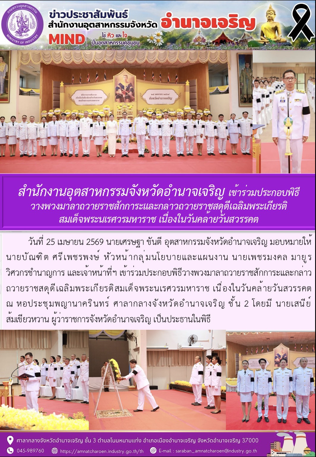 สำนักงานอุตสาหกรรมจังหวัดอำนาจเจริญ เข้าร่วมประกอบพิธี วางพวงมาลาถวายราชสักการะและกลาวถวายราชสดุดีเฉลิมพระเกียรติ สมเด็จพระนเรศวรมหาราช เนื่องในวันคลายวันสวรรคต
